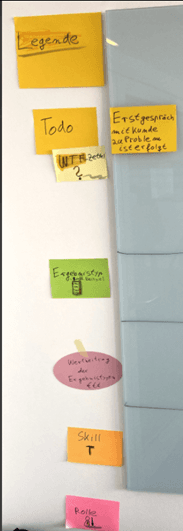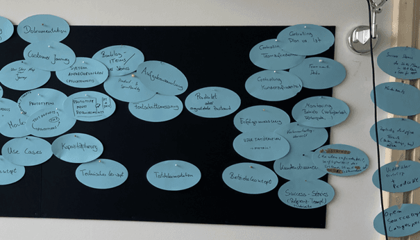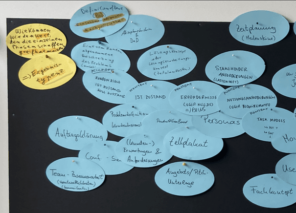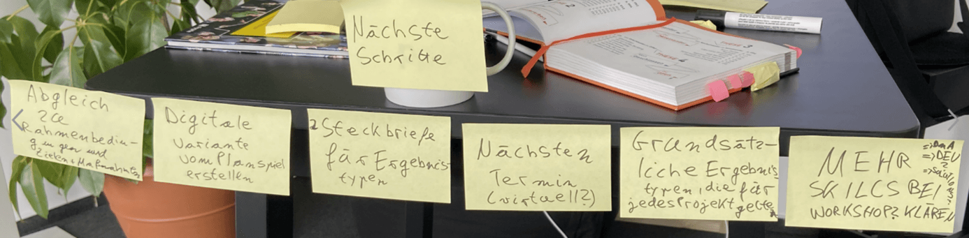 Insbesondere wurden sowohl die Rahmenbedingungen für eine gute Zusammenarbeit der verschiedenen Skills als auch die zu erstellenden Ergebnistypen pro Projektphase reflektiert. Zudem erarbeiteten die Teilnehmerinnen und Teilnehmer gemeinsam die No-Gos in Projekten sowohl in Zusammenarbeit mit Kunden als auch intern. Ein weiteres Ergebnis des vierstündigen Workshops war eine Wissens- und Konzeptgrundlage für ein Planspiel, das für Projekt-Kick-offs genutzt werden kann.