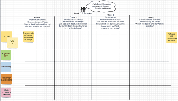 Basierend auf diesem Planspiel haben die Teilnehmerinnen und Teilnehmer von PPI.X die für das Anwendungsszenario relevanten Ergebnistypen nebst zugehöriger Wertbeiträge gemeinsam identifiziert und Fragen geklärt.