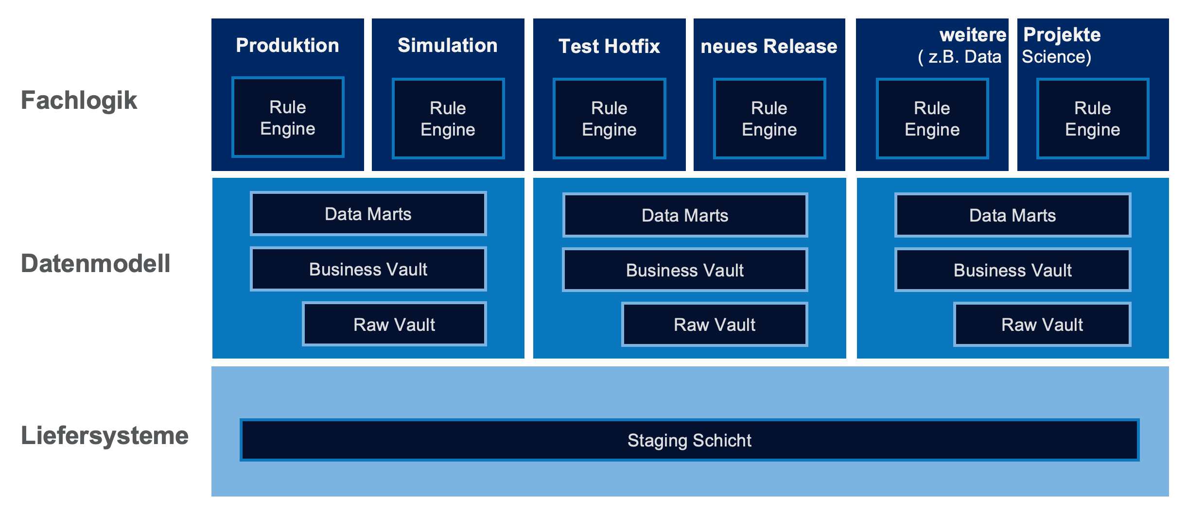 - Auf jeder Datenmodellschicht können parallel mehrere Schichten mit Fachlogiken gleichzeitig installiert und für Beladungen verwendet werden.