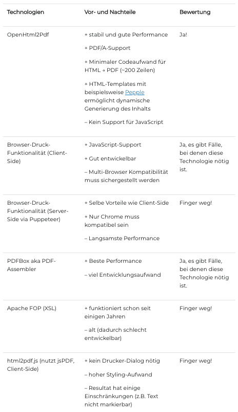 Zusammenfassend lässt sich sagen, dass wir mit OpenHtml2Pdf die Developer-Experience wie beim Entwickeln von Web-Anwendungen haben und damit auch schöne Dokumente mit komplexen Diagrammen einfach erzeugen können. Die Performance ist für alle unsere Usecases aktuell total in Ordnung und kann auch noch verbessert werden, sollte dies erforderlich sein. Daher ist OpenHtml2Pdf unsere Empfehlung.
