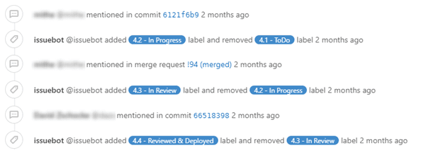 In der ersten Zeile wird ein Commit mit Erwähnung des Tickets registriert. Darauf lauscht der Issuebot, sieht, dass die Umsetzung begonnen hat, und passt den Status an. Danach wird die Lösung durch den/die Entwickler*in in Form eines Merge Request bereitgestellt, damit diese Lösung im Anschluss an die Qualitätssicherung durch ein weiteres Teammitglied mit der Code-Base zusammengeführt werden kann (Vier-Augen-Prinzip). Auch das bekommt der Issuebot mit und passt wiederum den Status auf „In Review“ an. Zuletzt wird nach abgeschlossener QS und dem erfolgreichen Merge der Status automatisch auf „Reviewed & deployed“ gesetzt.