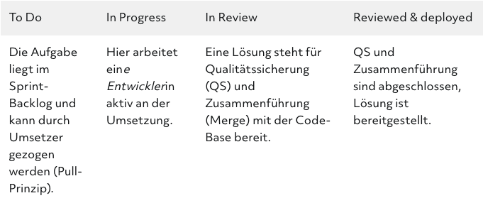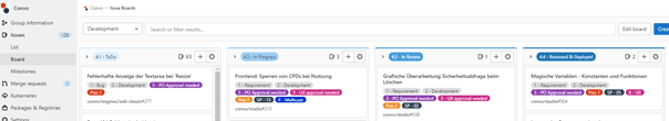 In unseren agilen Entwicklungsprojekten sind die Aufgaben in Form von Tickets beziehungsweise Issues festgehalten – in den meisten Projekten von uns verwenden wir dazu GitLab. Nachdem sie das Refinement durchlaufen haben, haben sie in der Regel eine Qualität erreicht, sodass es keine offenen Fragen mehr zu ihnen gibt. Sind sie dann für einen Sprint eingeplant, durchlaufen in diesem Zeitraum unterschiedliche Phasen auf unseren Kanban-Boards: