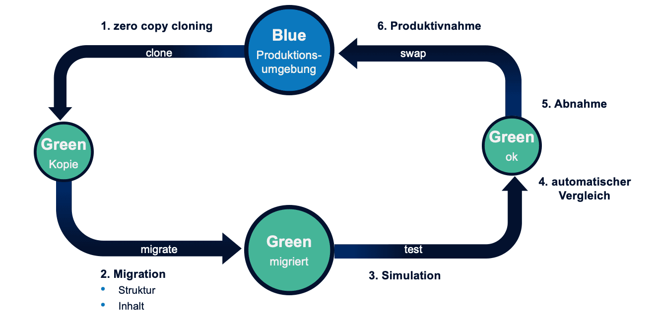 Zuerst wird vom produktiven DWH (Blue Umgebung) mit Hilfe des Zero Copy Clonings von Snowflake eine Kopie (Green Umgebung) erstellt. Diese Kopie ist vollständig identisch zur Produktion (Daten, Strukturen, Rechte, Ladeprogramme). Da nur Metadaten kopiert werden, fallen dafür keine zusätzlichen Speicherkosten an. - Migration