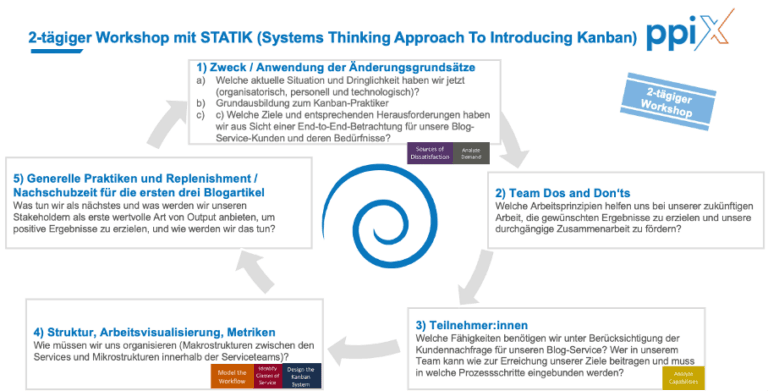 Abbildung 3: Nutzung des STATIK-Ansatzes aus der Kanban-Methode, um ein gemeinsames Verständnis zu erlangen und geeignete erste Schritte für eine evolutionäre Veränderung eines Teams abzuleiten