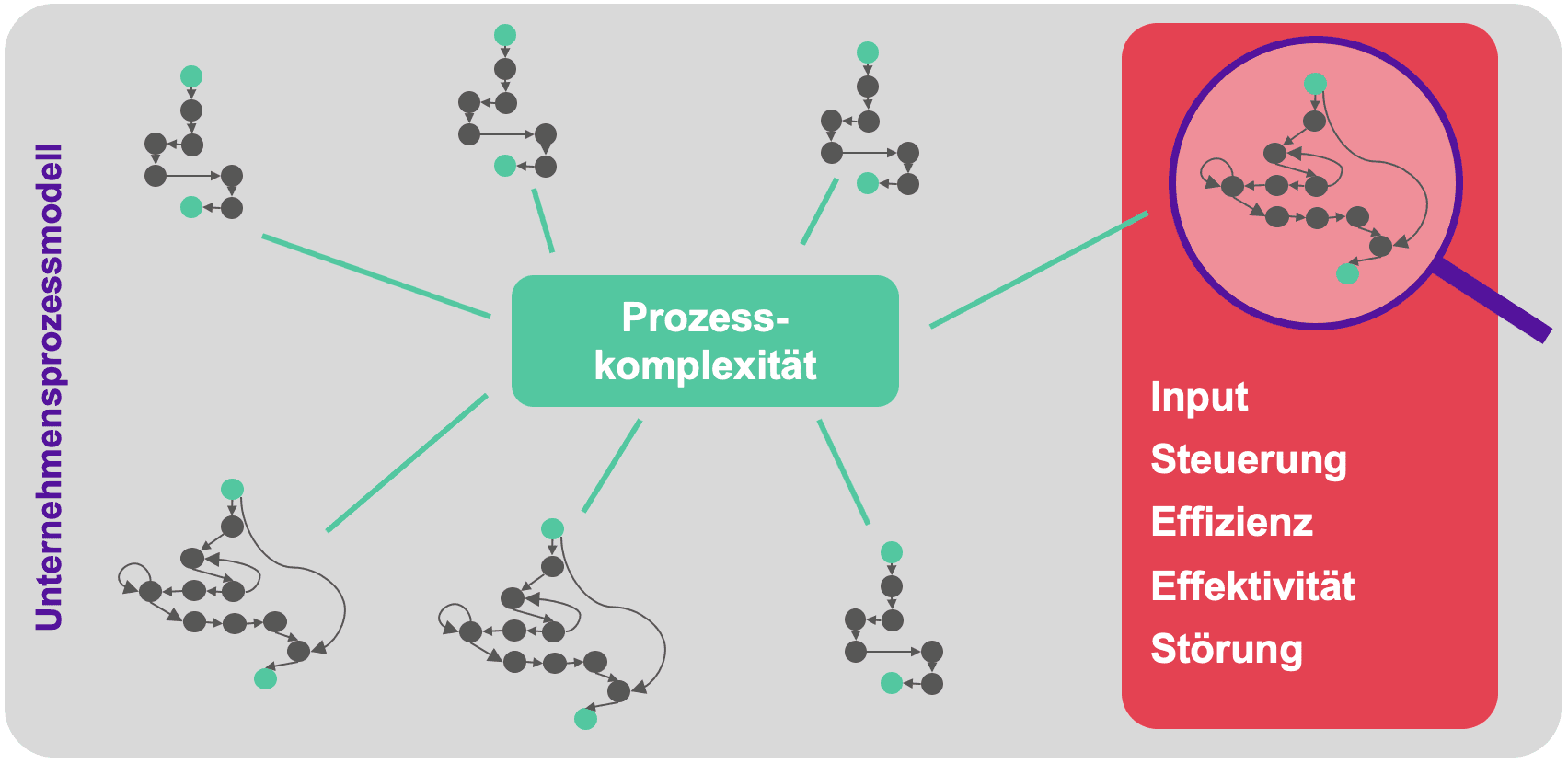 Wird der Einstieg über das Unternehmensprozessmodell von außen mit größer werdenden Prozessfokus gewählt, sollte man sich vorerst einmal mit der Vielzahl der vorhandenen Prozesse (Prozesskomplexität) und den zu berücksichtigten Aktivitäten und Ereignissen auseinandersetzen. Gesamtdurchlaufzeiten können über den frühesten und spätesten Zeitpunkt mit in die Betrachtung einbezogen werden. Ein zusätzlicher Indikator für die Prozesskomplexität ist die Anzahl der zugrundeliegenden Prozessvarianten, welche Aufschluss über Vielseitigkeit, Optimierungspotenzial und Fehlerquote geben. Eine solche Darstellung ist in gängigen Process Mining Lösungen, wie Celonis, Fluxicon Disco oder process.science bereits über den Prozessvarianten Explorer integriert.