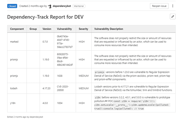 - Dependecybot aktualisiert seine Tickets. Kommt eine neue Sicherheitslücke hinzu oder wird eine geschlossen, erzeugt er kein neues Ticket, sondern fügt in der Tabelle eine Zeile hinzu beziehungsweise entfernt eine.
