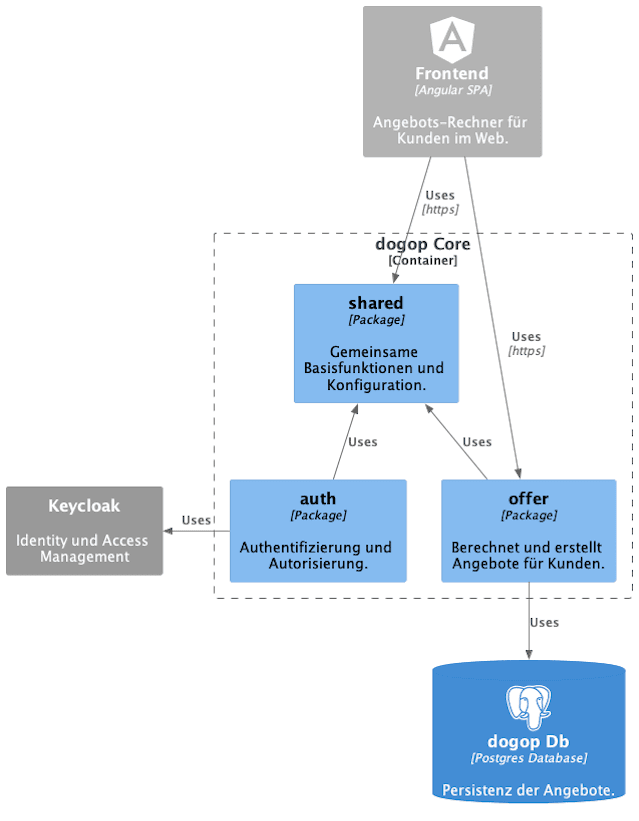 Das Package `offer` enthält den Angebotsrechner unserer HundeOP. Alles rund um Authentifizierung und Autorisierung liegt im Package `auth`. Was übergreifend über alle Domänen genutzt wird liegt, z.B. die Konfiguration, liegt im gemeinsamen Package `shared`.