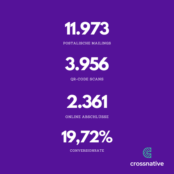 Die erste Upselling-Kampagne mit Fokus auf Online-Abschluss ging im Juni live. Hierbei handelte es sich ebenfalls um eine Aktion, die regelmäßig jedes Jahr von der Versicherung geschaltet wurde. Neu war dieses Mal, dass wir die Kampagne über das Marketing Automation Tool abbildeten sowie die bisherige Customer Journey optimierten. Diese zwei ausschlaggebenden Faktoren machten die Kampagne zur erfolgreichsten Kampagne in der Unternehmensgeschichte, so das Feedback des Kunden. Wir haben bisher bei 11.973 Teilnehmern eine Conversionrate von 19,72% erzielt und stehen bei 2.361 digitalen Abschlüssen einer Zahnzusatzversicherung. Es haben bisher 3.956 Teilnehmer den QR-Code auf dem postalischen Mailing gescannt, d. h. knapp 60 % haben nach dem Scan auch tatsächlich abgeschlossen. Eine durchschnittliche Conversionrate liegt vergleichsweise bei 2 – 4 % und kann je nach Produkt und Branche natürlich höher ausfallen.