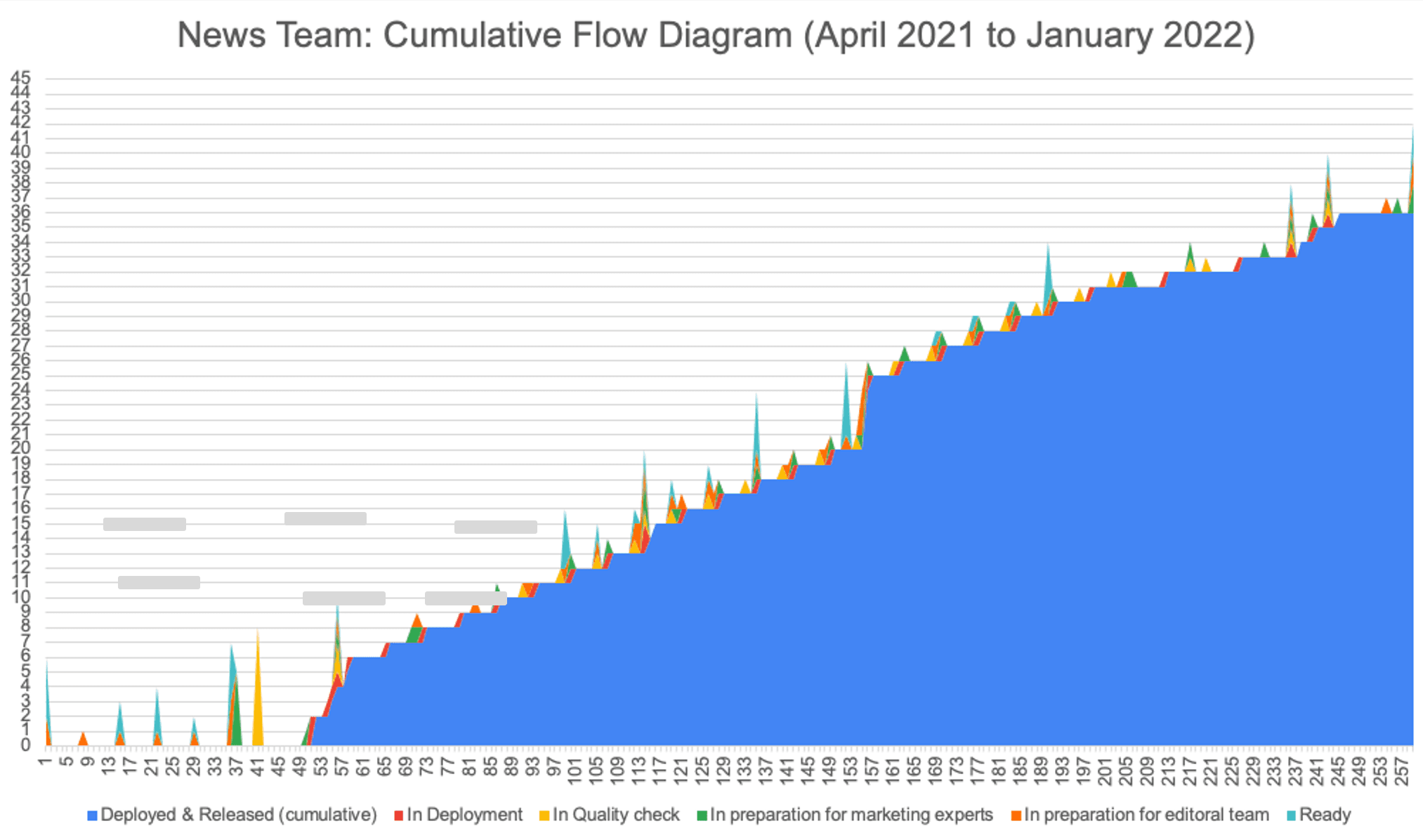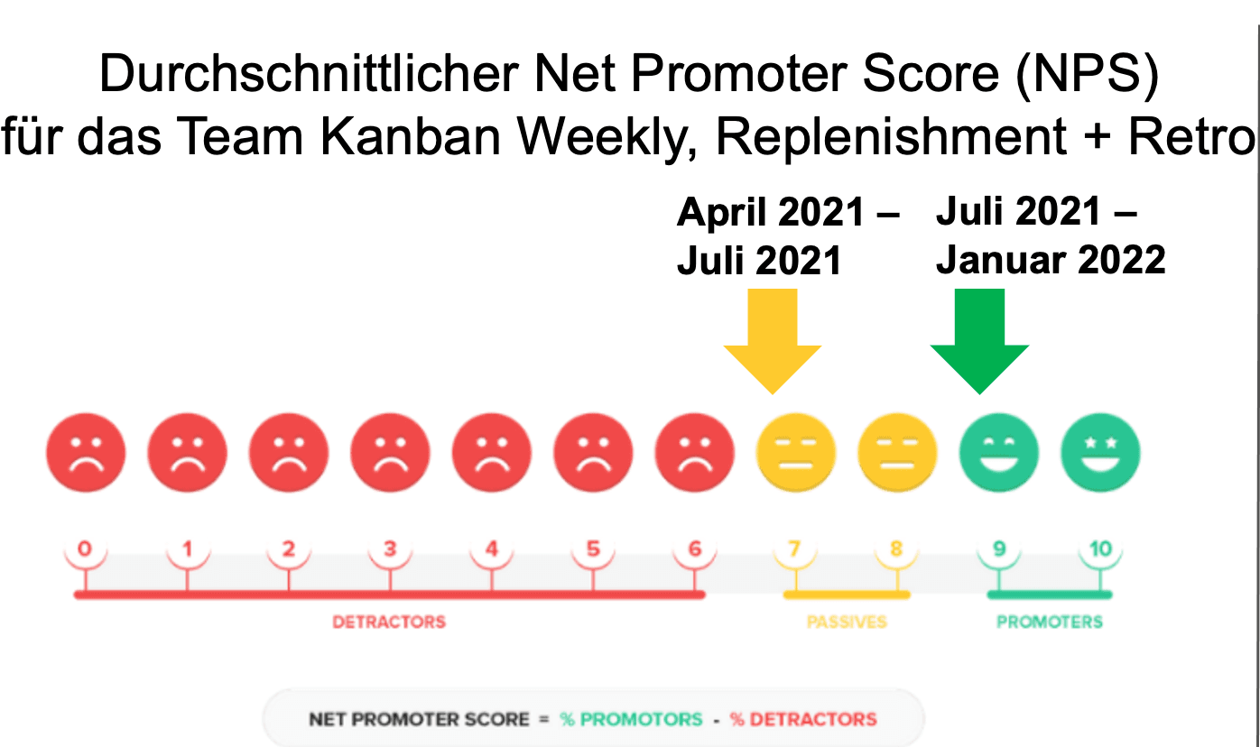 Die zweite Abbildung visualisiert einen exemplarischen durchschnittlichen Net Promoter Score (NPS) von April bis Ende Juni 2021 und den Zeitraum von Juli bis Januar 2022. Kanban fördert häufig eine echte, evolutionäre Veränderung in meinen Teams, die sich häufig aus Mitgliedern verschiedener Abteilungen zusammensetzten, sodass Verbesserungen Schritt für Schritt sichtbar und verständlich erfolgten. Es war für alle sehr zufriedenstellend, auch die positiven Auswirkungen zu sehen, die sich daraus ergeben, dass unsere Arbeit und unser Arbeitsfluss bzw. Fluss von Wert sichtbar gemacht werden, wie in Abbildung 1 gezeigt.