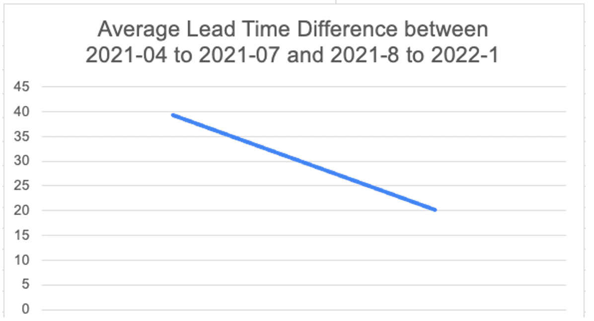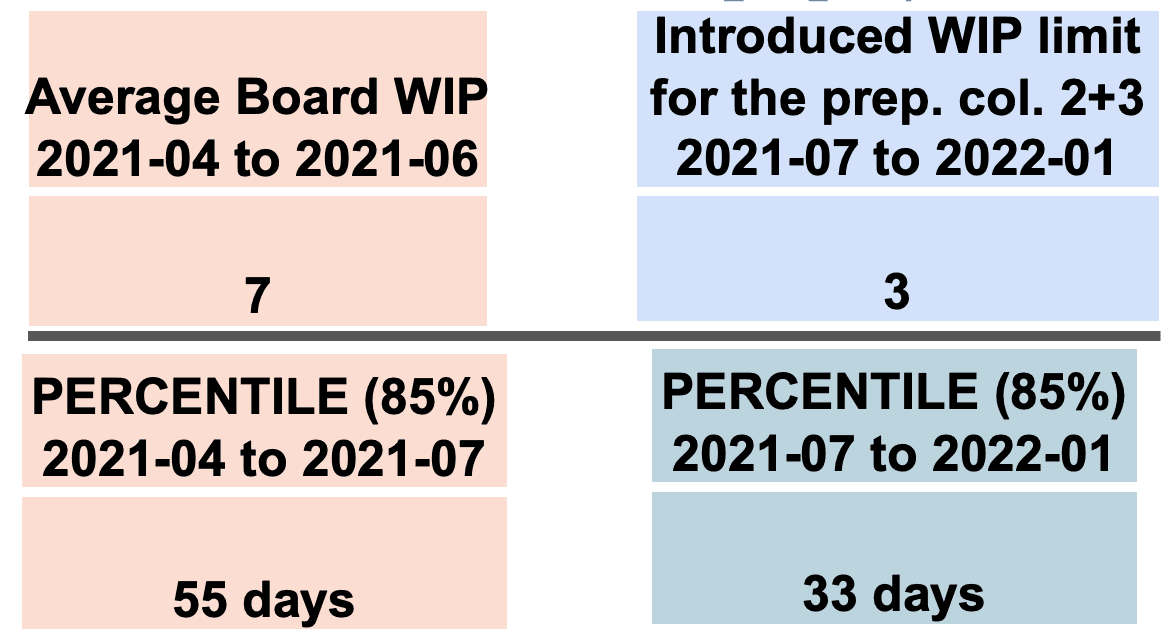 - Die durchschnittliche Durchlaufzeit sank unter anderem durch die Einführung von WIP-Limits von 39 auf 20, siehe Abbildung 5.