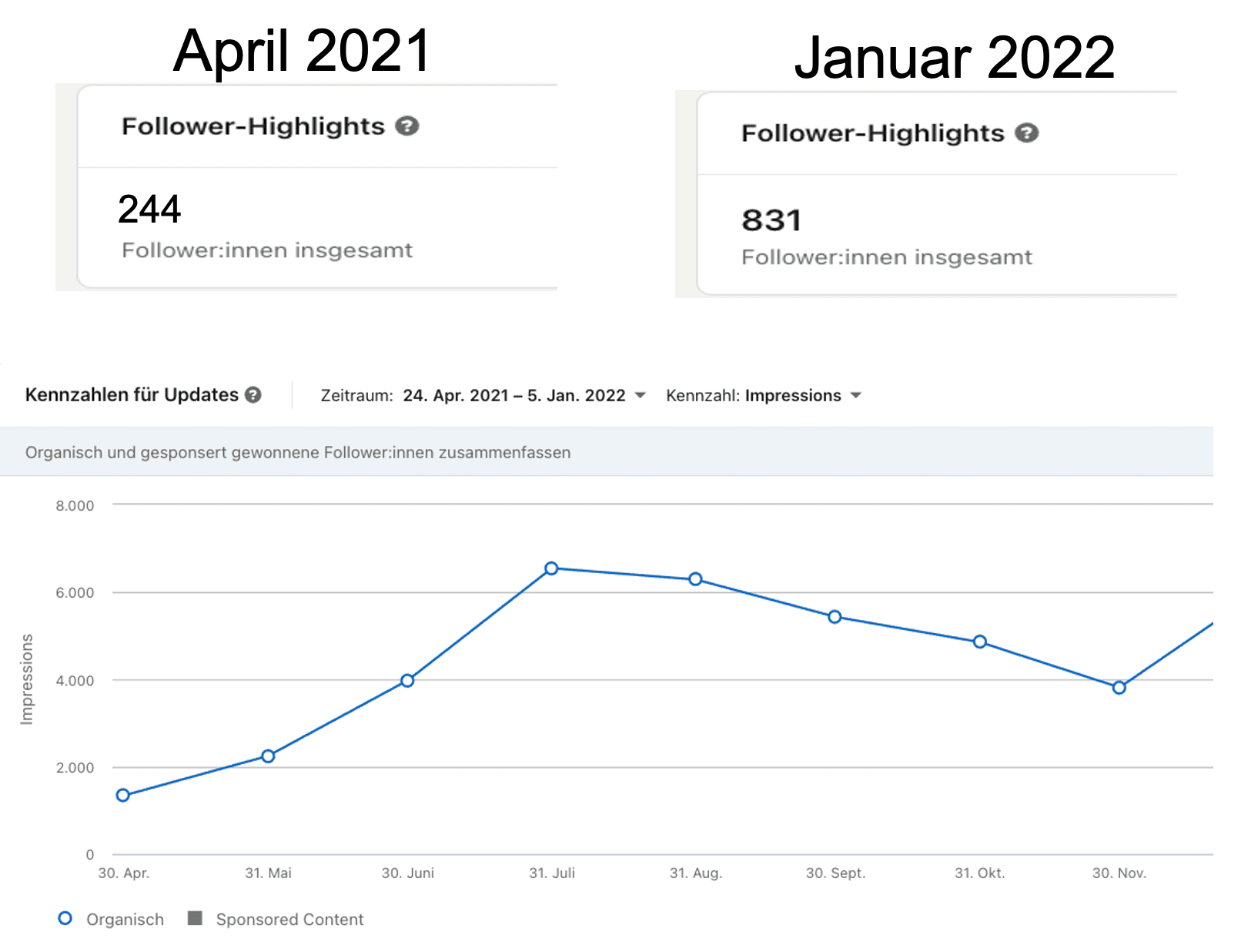 Wir konnten von Ende Juli – bis Januar 2022 35 Artikel, deutlich mehr Blogartikel, bereitstellen und veröffentlichen. Diese häufig neuen Inhalte (im Durchschnitt zwei- bis dreimal pro Woche) führten zu einer deutlichen Verbesserung der Follower und (noch wichtiger) Impressionen unserer Inhalte, siehe Abbildung 3.